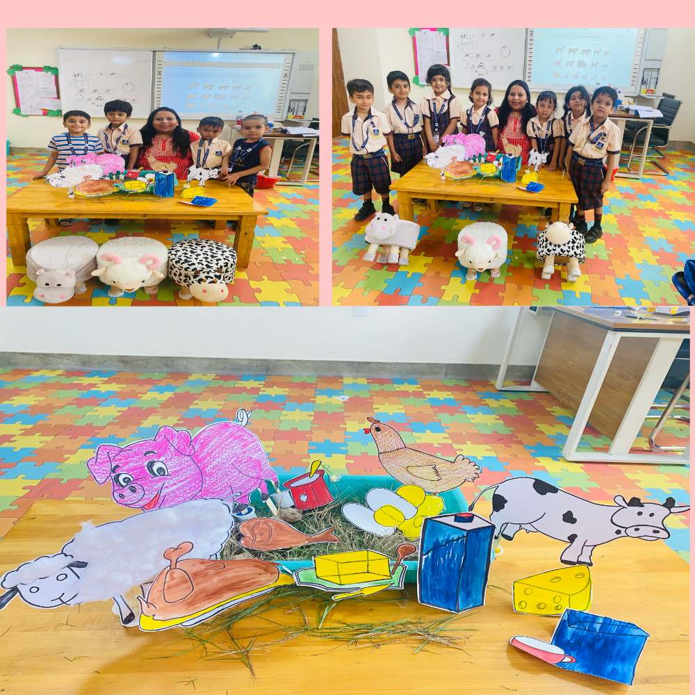 Hands-on learning is the process of learning by actually doing and experiencing something, rather than just being told about it. Children are encouraged to learn through exploration and thinking skills. Building on the theme Farm to Table, the students of Kindergarten engaged in a plethora of activities to understand the theme better. Teaching kids where their food comes from is an important step in developing an understanding of healthy eating. Students engaged in various activities like listening to farm-related stories, sorting and matching pictures of foods and animals, participating in farm related sensory activities, making farm crafts and learning songs related to animals in the farm. A learning corner was created in the classroom where the teachers explained what products we get from animals and by the end of the sessions, the students were well versed with the theme and could easily explain the process of food from the farm to the table.