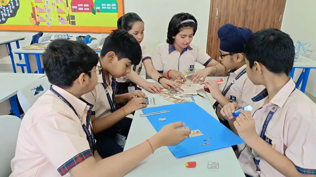 Engaging students in the creation of large number collages using newspapers offers a dynamic approach to understanding the relevance of numbers in our daily lives.Under the NEP’s experiential learning approach, students of Grade VI , scour through the pages, searching for large numbers, and not only sharpen their numerical skills but also immerse themselves in real-world contexts where numbers play a crucial role. From deciphering the price tags of goods to tallying up populations in news articles, every digit encountered becomes a doorway to comprehension. Through this hands-on activity, students did not only learn to read and write large numbers but also developed a deeper appreciation for their significance in the world around them.