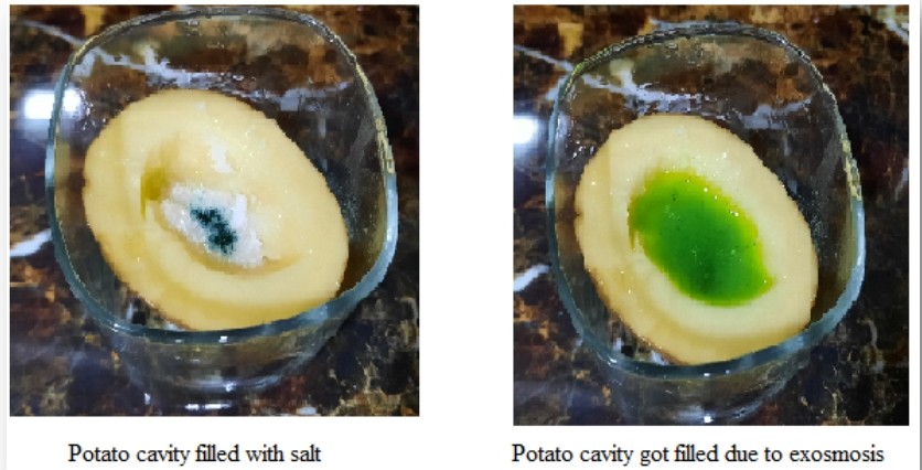 The process of osmosis was made understood by three simple activities. The first activity involved observing osmosis in deshelled eggs. Students performed simple experiments of osmosis in potato using salt and sugar (green food colour was added to make the rise in water level more evident). Concepts of endosmosis and exosmosis were further clarified with experiment with resins.