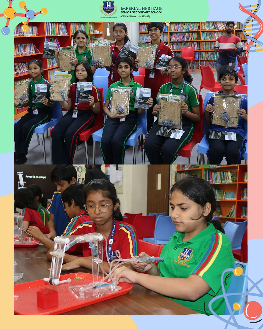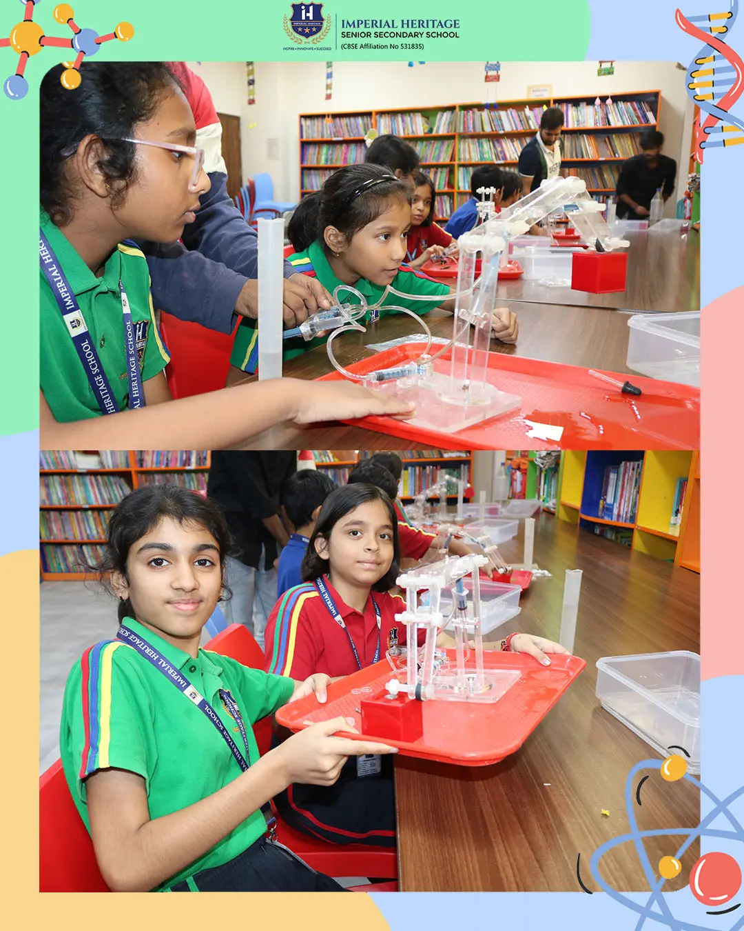 Grades VI–X engaged in an advanced engineering challenge by building hydrobots — water-powered machines that demonstrated fluid pressure, hydraulic systems, and Pascal’s Law.
