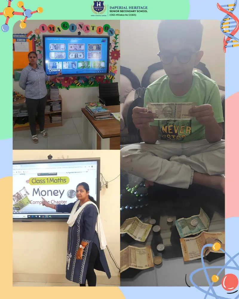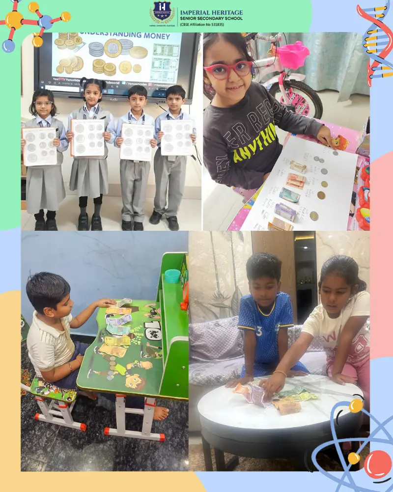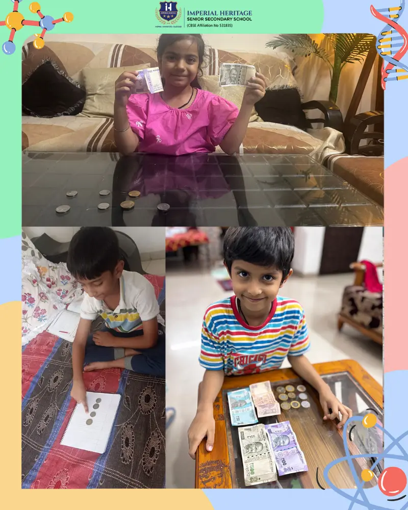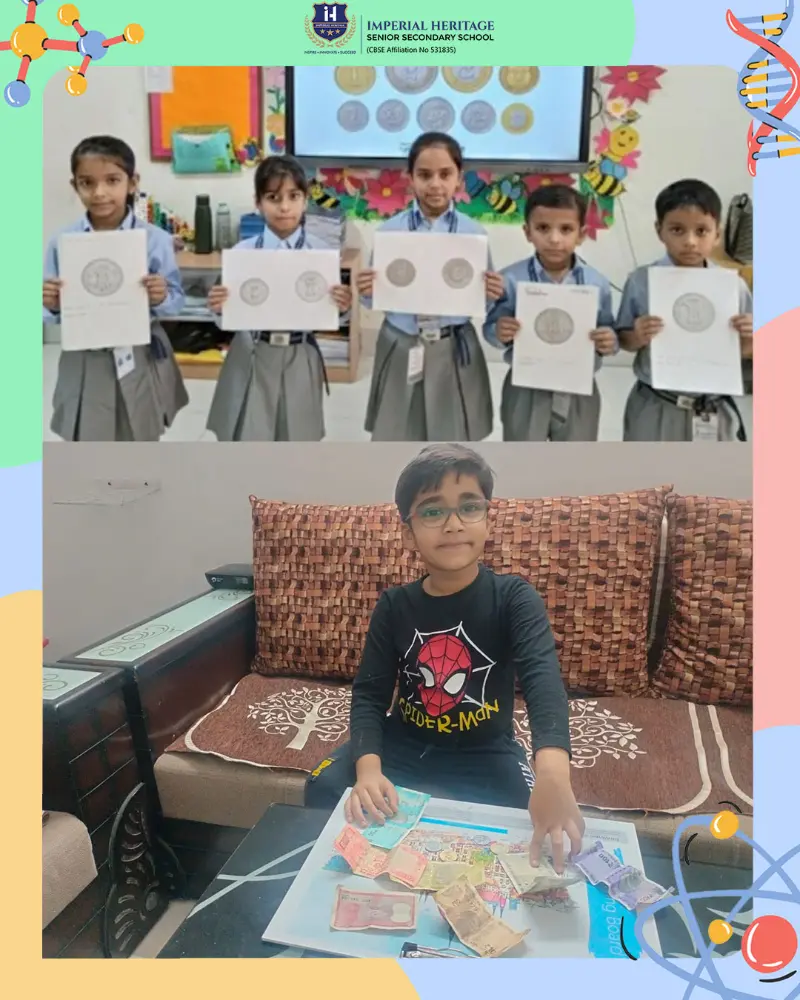 The chapter on Money was introduced with real currency, sparking curiosity and excitement among the students of Grade I. Teachers guided them to observe and classify coins and notes based on their shape, color, and value, making abstract concepts tangible and relatable. To deepen understanding, children watched an engaging audio-visual presentation that reinforced key ideas. This was followed by a delightful hands-on activity at home, where students explored coins and notes from their surroundings. They touched, observed, and demonstrated their findings, sharing their insights with enthusiasm. One of the most loved activities was coin tracing—children eagerly scribbled with their pencils to imprint the coin’s shape into their notebooks, creating a personal connection with the learning. Their joy was evident as they proudly showcased their coin impressions and described their features.