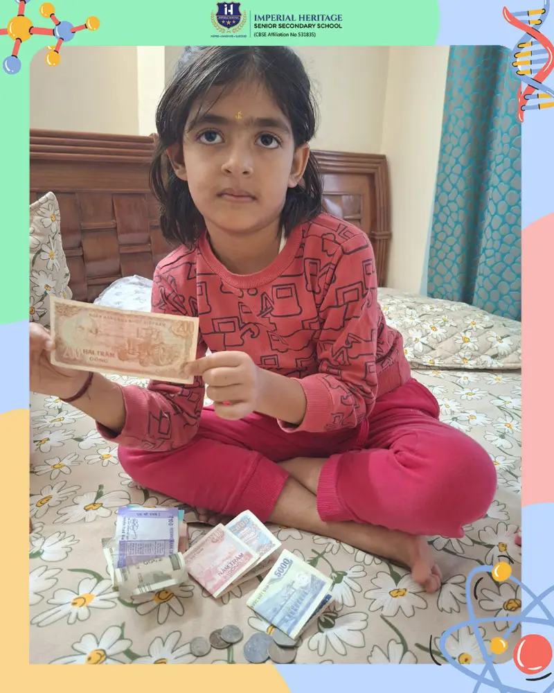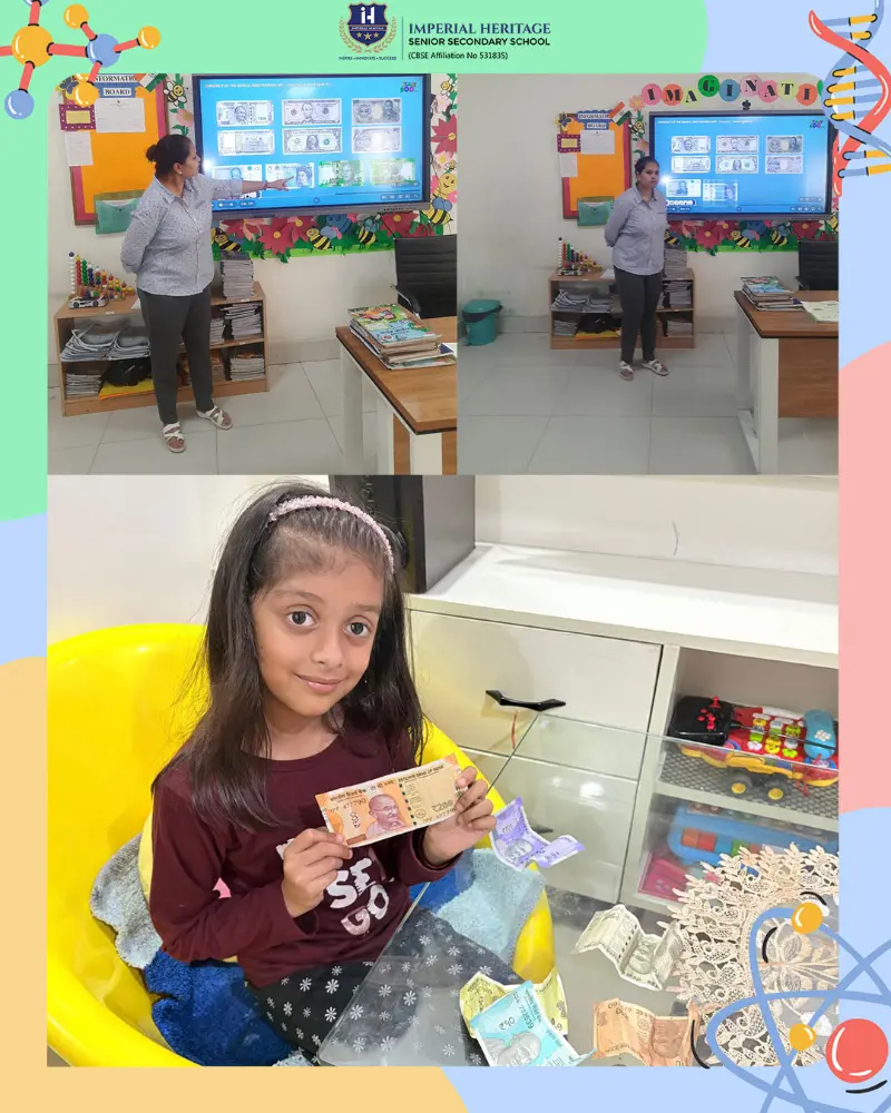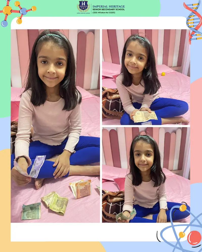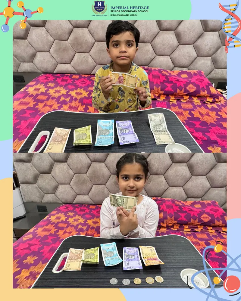The chapter on Money was introduced with real currency, sparking curiosity and excitement among the students of Grade I. Teachers guided them to observe and classify coins and notes based on their shape, color, and value, making abstract concepts tangible and relatable. To deepen understanding, children watched an engaging audio-visual presentation that reinforced key ideas. This was followed by a delightful hands-on activity at home, where students explored coins and notes from their surroundings. They touched, observed, and demonstrated their findings, sharing their insights with enthusiasm. One of the most loved activities was coin tracing—children eagerly scribbled with their pencils to imprint the coin’s shape into their notebooks, creating a personal connection with the learning. Their joy was evident as they proudly showcased their coin impressions and described their features.