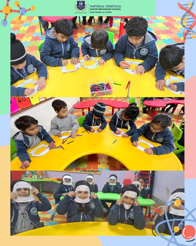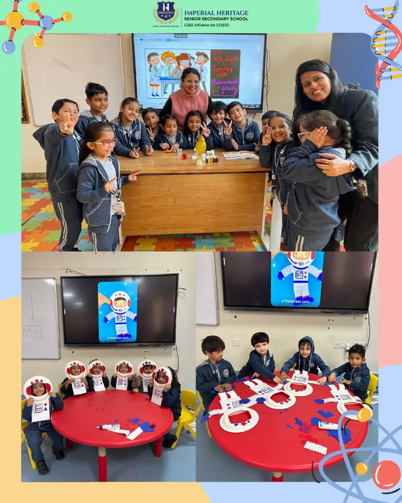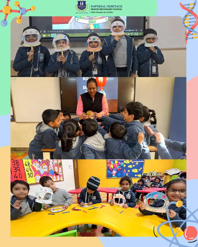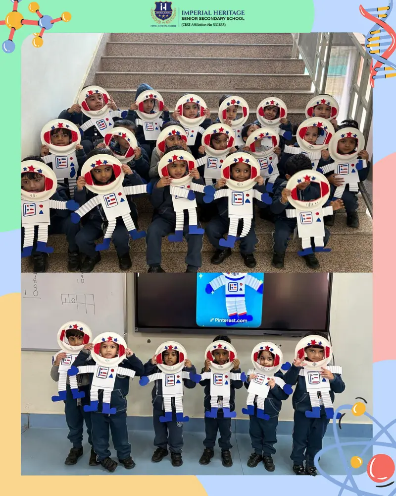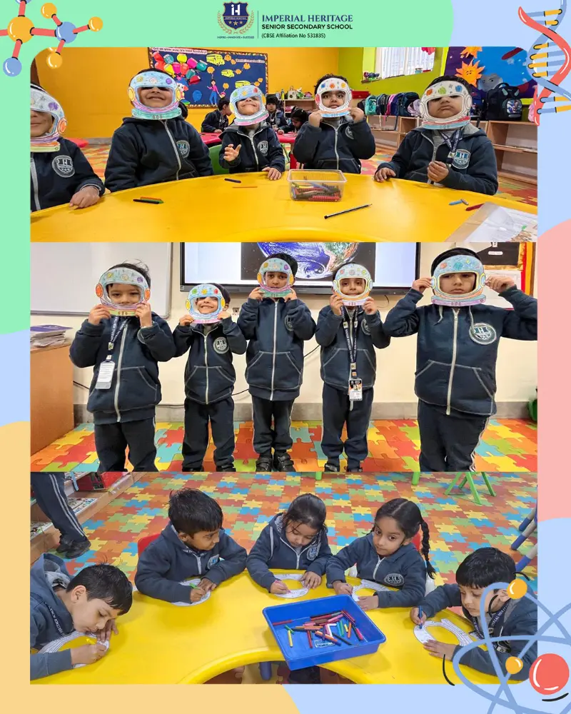Nursery students joyfully created colourful astronauts using paper plates and craft materials, carefully assembling each part. LKG children enthusiastically designed vibrant astronaut face masks, decorating them with bright colours and shiny stars to boost their creativity and fine motor skills.