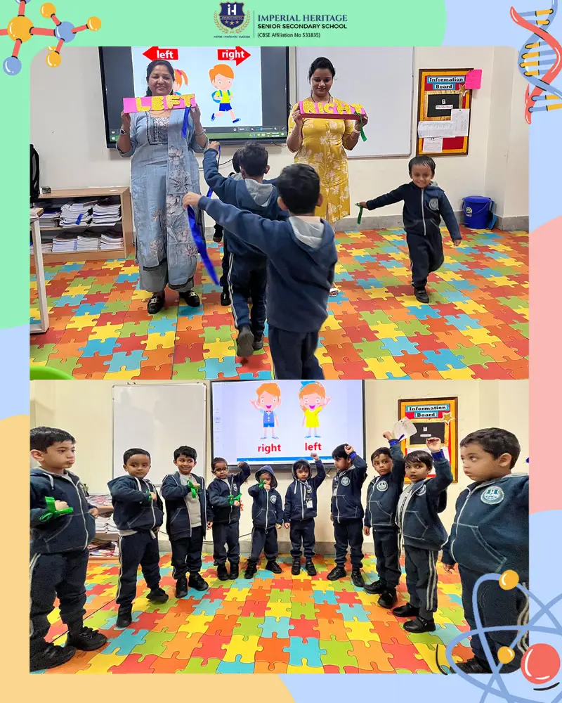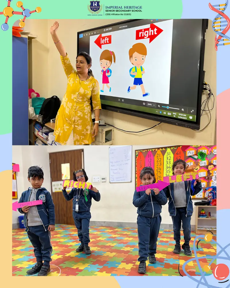 The teacher first helped children recognize the concept of left and right by asking them to raise their left and right hands and touch their left ear, right ear, left knee, and right knee, giving them repeated practice to understand that left and right belong to their bodies. To make learning easier, coloured wristbands were used—blue on the left hand and green on the right—while children followed simple instructions like “Wave your left hand” and “Tap your right foot.” Learning was further reinforced through action-based games such as Simon Says and Follow the Teacher, where children moved or touched body parts according to left or right directions, making the activities fun, interactive, and memorable
