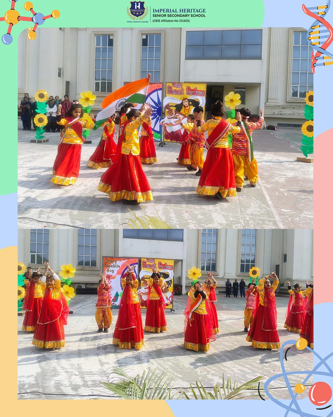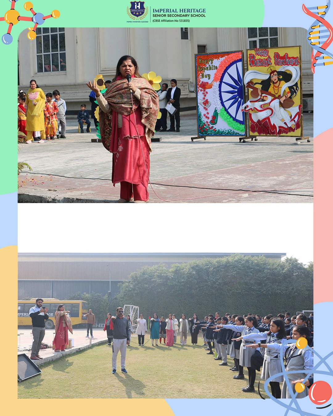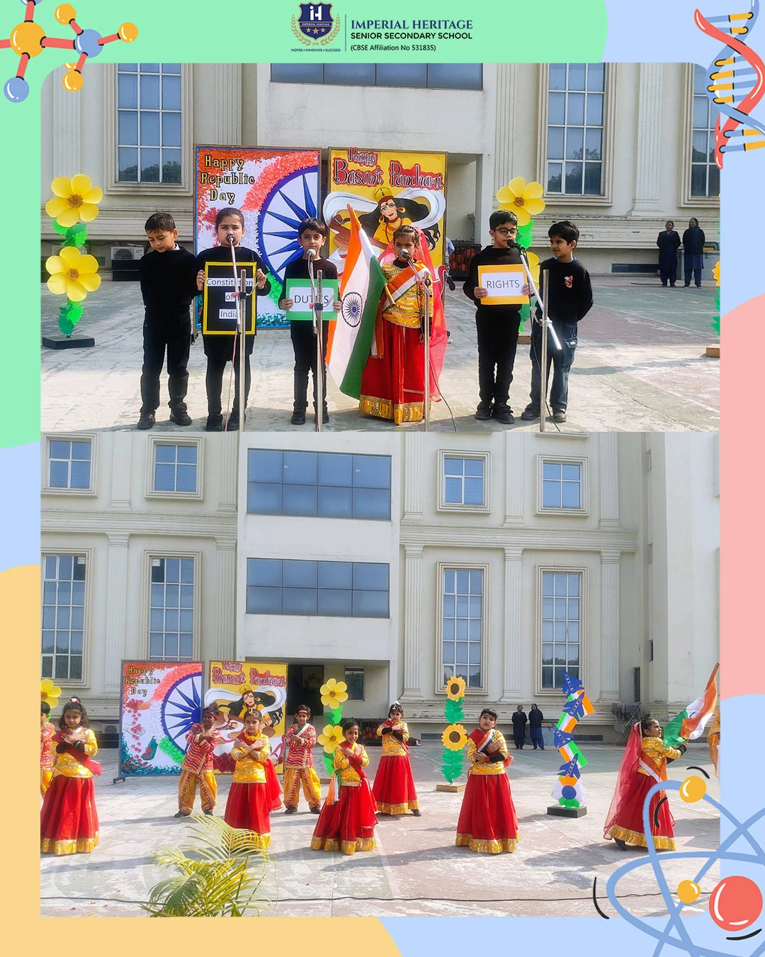 Our respected Principal, Ms. Neelu Sharma, addressed the students and extended her warm wishes on both occasions. She spoke about the importance of the Indian Constitution and Goddess Saraswati, sensitively highlighting the significance of these two special days and inspiring young minds to value knowledge, responsibility, and patriotism.