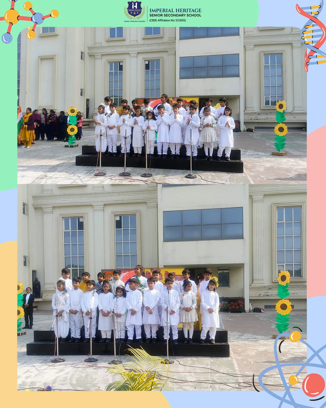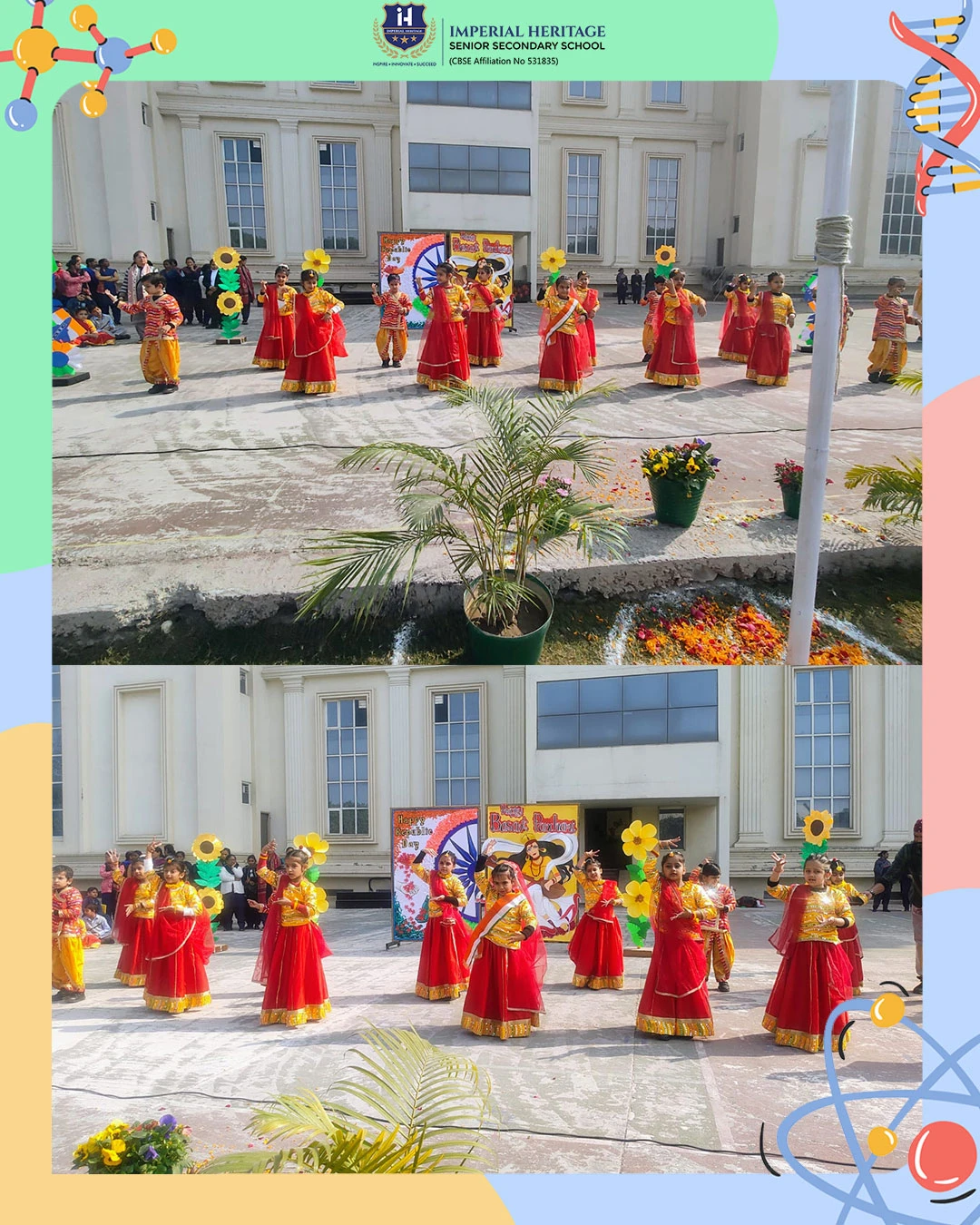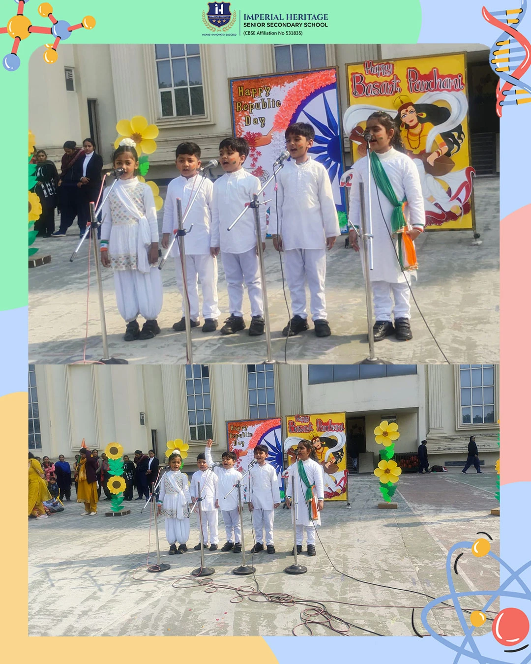 Our respected Principal, Ms. Neelu Sharma, addressed the students and extended her warm wishes on both occasions. She spoke about the importance of the Indian Constitution and Goddess Saraswati, sensitively highlighting the significance of these two special days and inspiring young minds to value knowledge, responsibility, and patriotism.