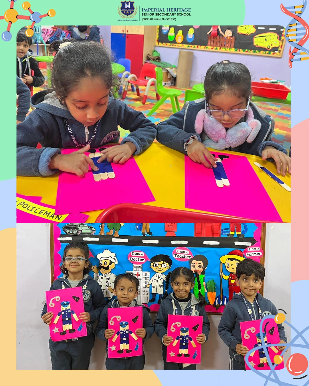 LKG children joyfully created a colourful policeman craft, developing hand-eye coordination while learning about the role of a policeman in keeping us safe.