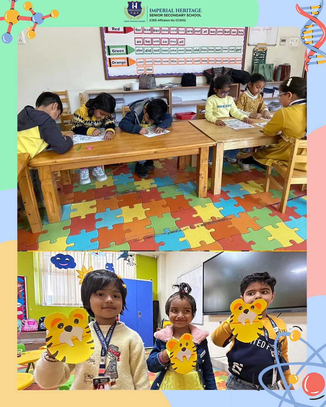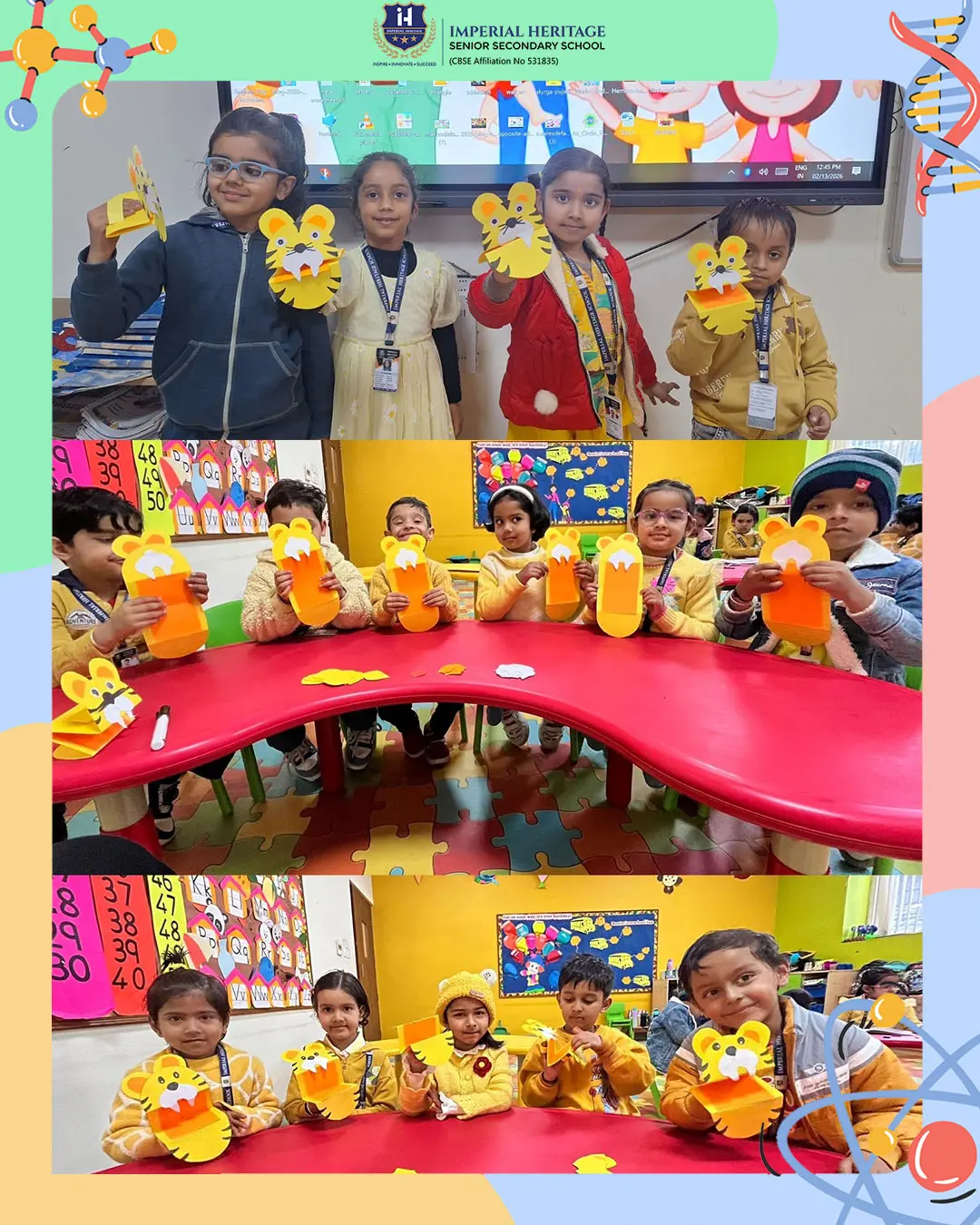 Our Nursery stars explored creativity through sponge painting colourful shopping bags and making adorable happy faces. LKG children had a roaring good time crafting tiger face puppets while learning fun facts about tigers and strengthening their fine motor skills. UKG students showcased their imagination by designing vibrant giraffe pencil holders with sponge painting and detailed pasting work.