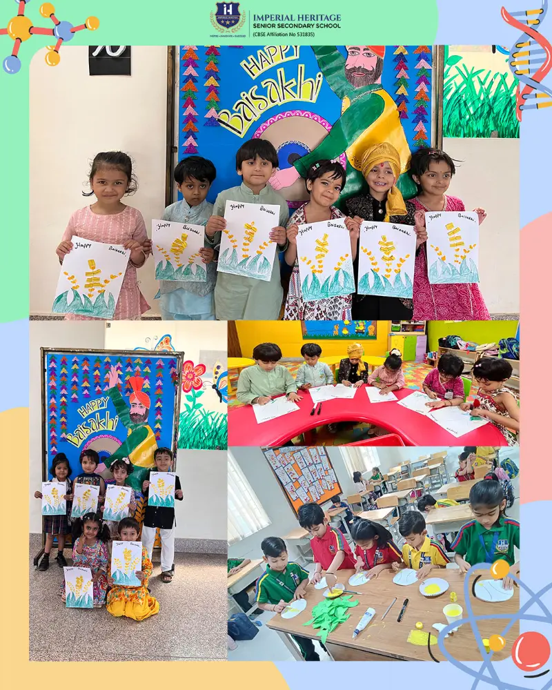 Similarly, Grade I students showcased their creativity by designing beautiful Baisakhi cards with bright colours, leaf cutouts, and finger painting, making each piece unique and expressive. Meanwhile, Grade II students created vibrant festive scenes with dhols, kites, and golden corn, deepening their understanding of the cultural significance of Baisakhi in a fun and engaging way. From creative crafts to energetic dance performances, every child truly embraced the spirit of the harvest festival, making it a memorable day filled with learning, happiness, and festive cheer.