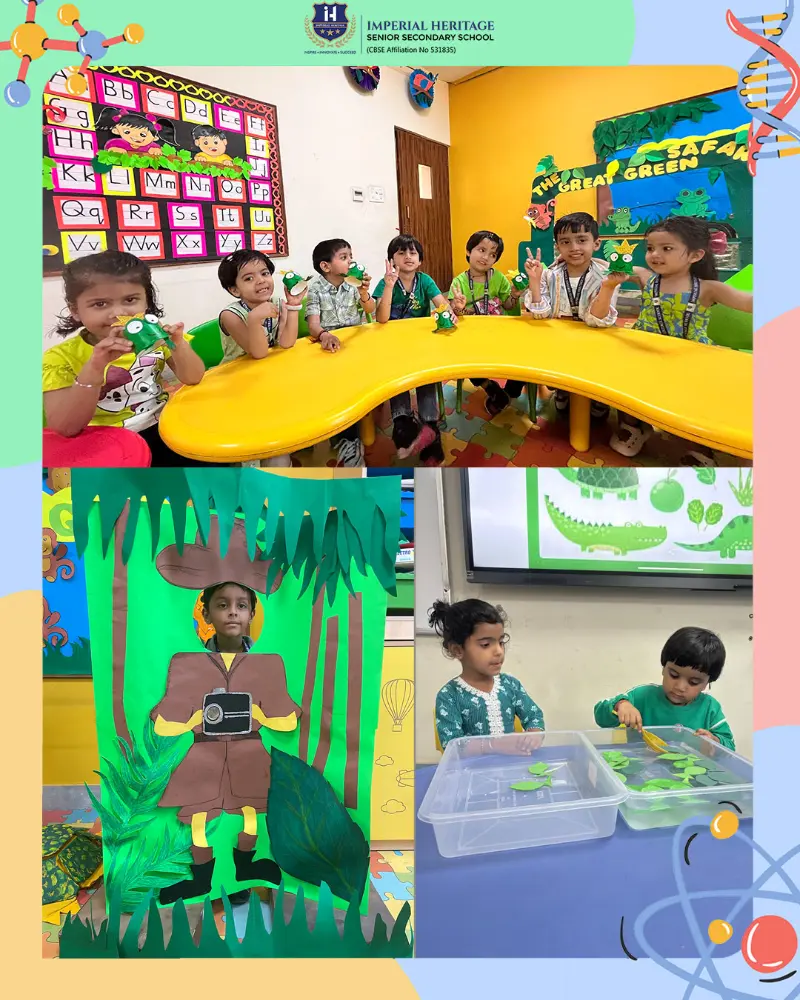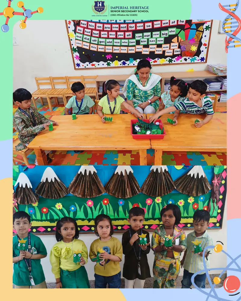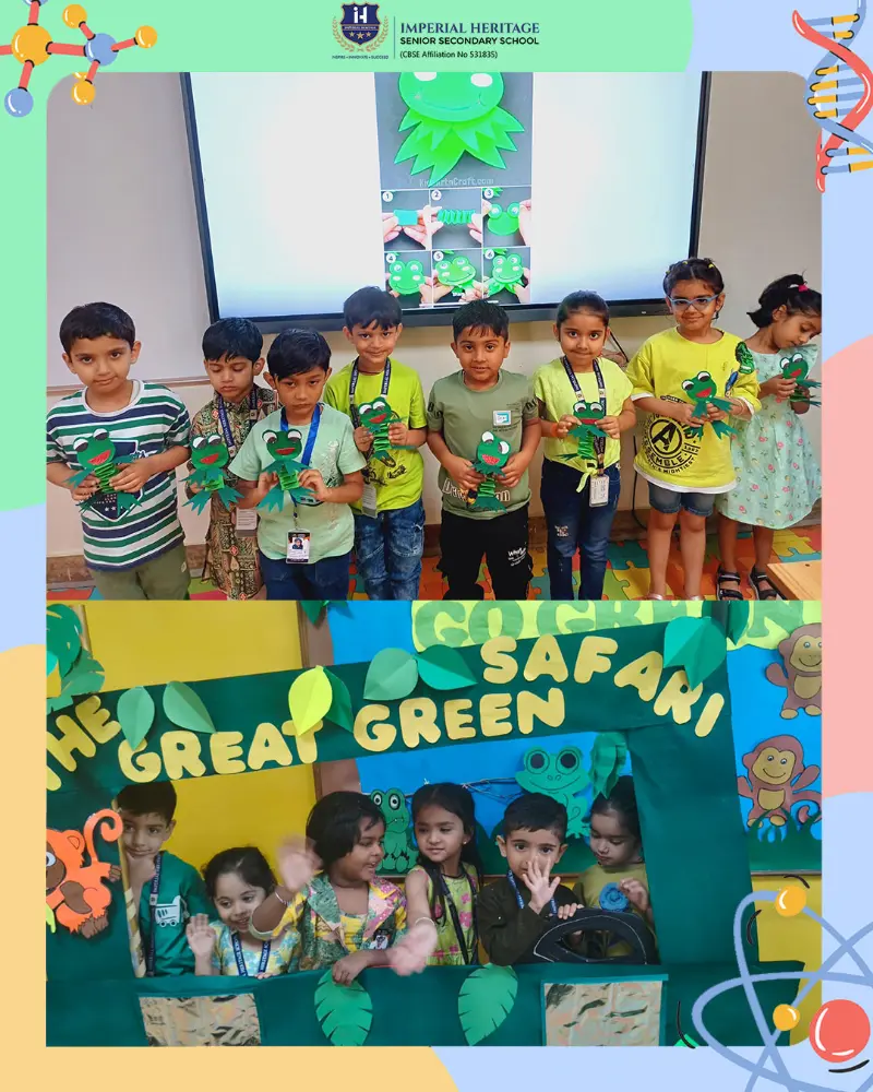 Our UKG children added to the excitement by creating jumping frog crafts and going on a refreshing nature walk. They confidently spoke about green vegetables, enhancing both their awareness and communication skills while connecting meaningfully with the greenery around them.
