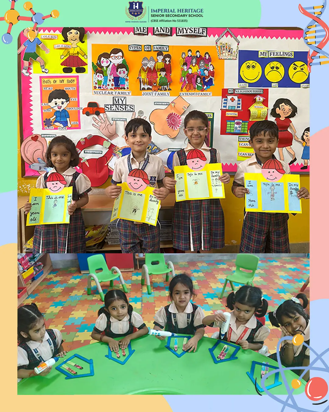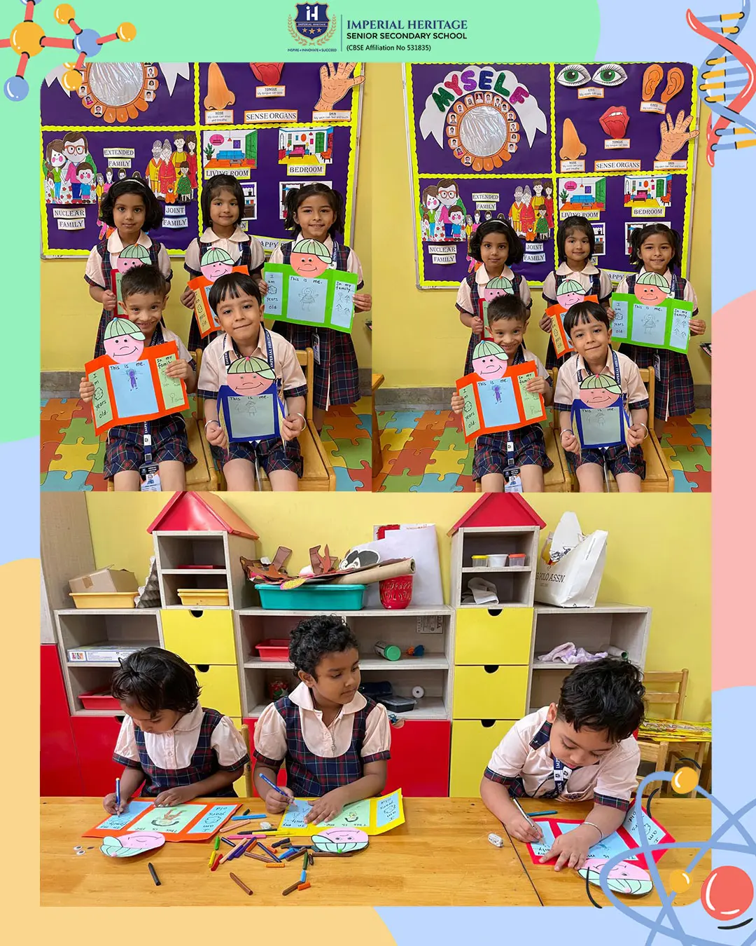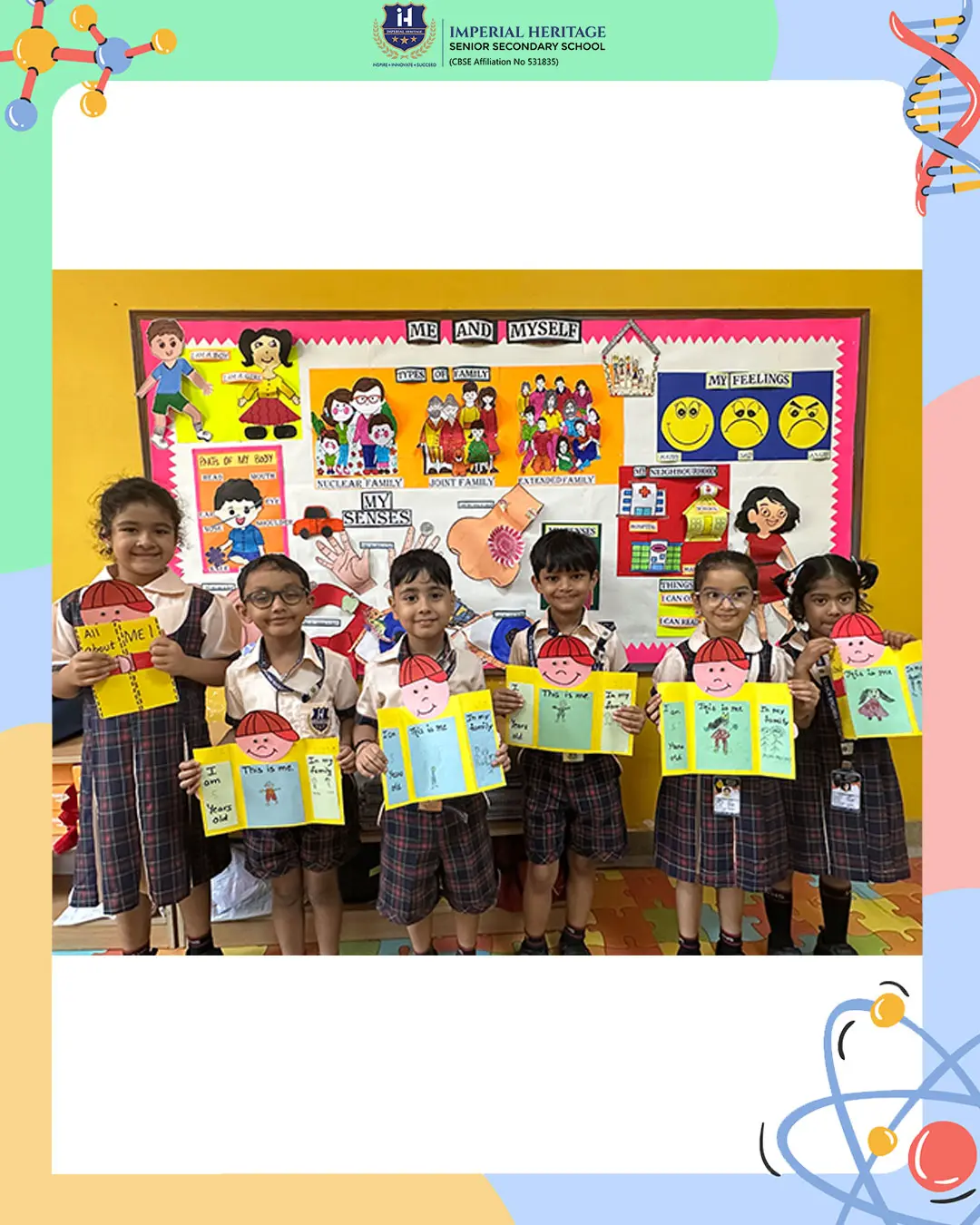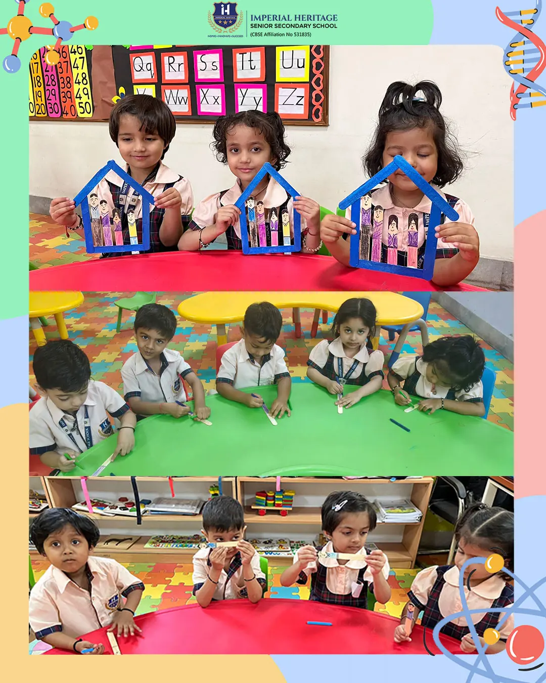 The highlight of the week was the “My Popsicle Family” activity by LKG, where children used colourful ice cream sticks to creatively represent their family members, beautifully showcasing their love and bonds. Our UKG students designed their own “All About Me” cards, “My Colourful Self,” sharing their age, drawing themselves, and illustrating their families with vibrant colours.