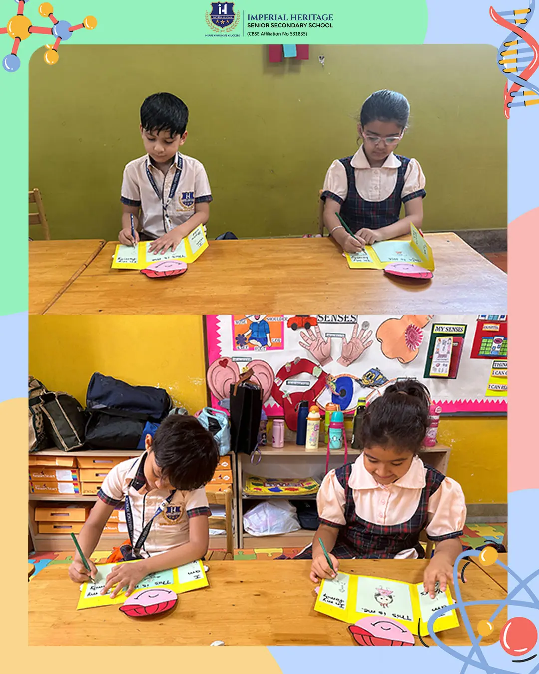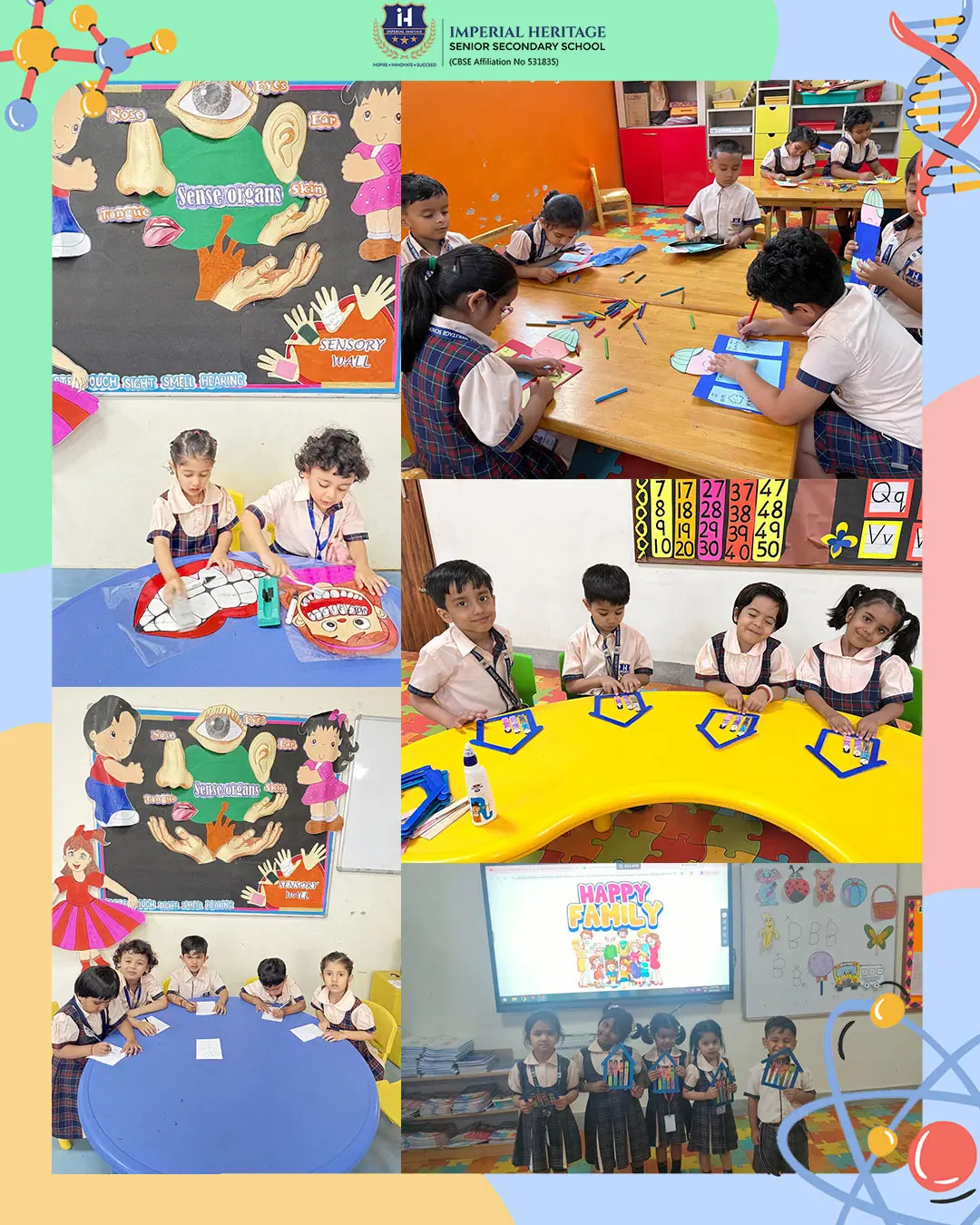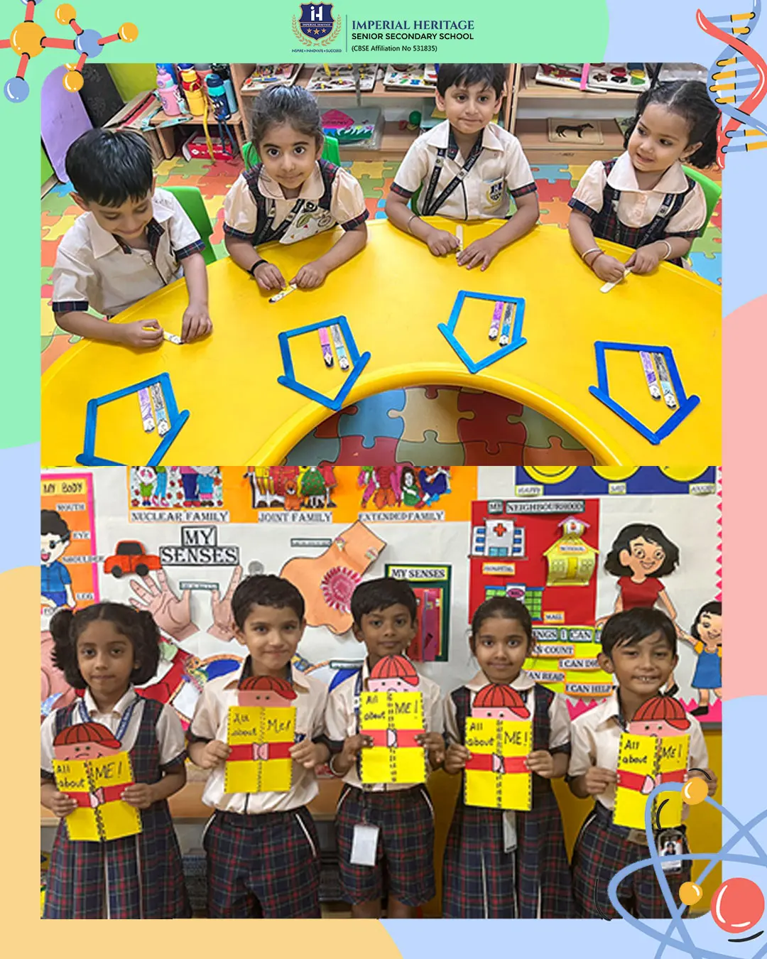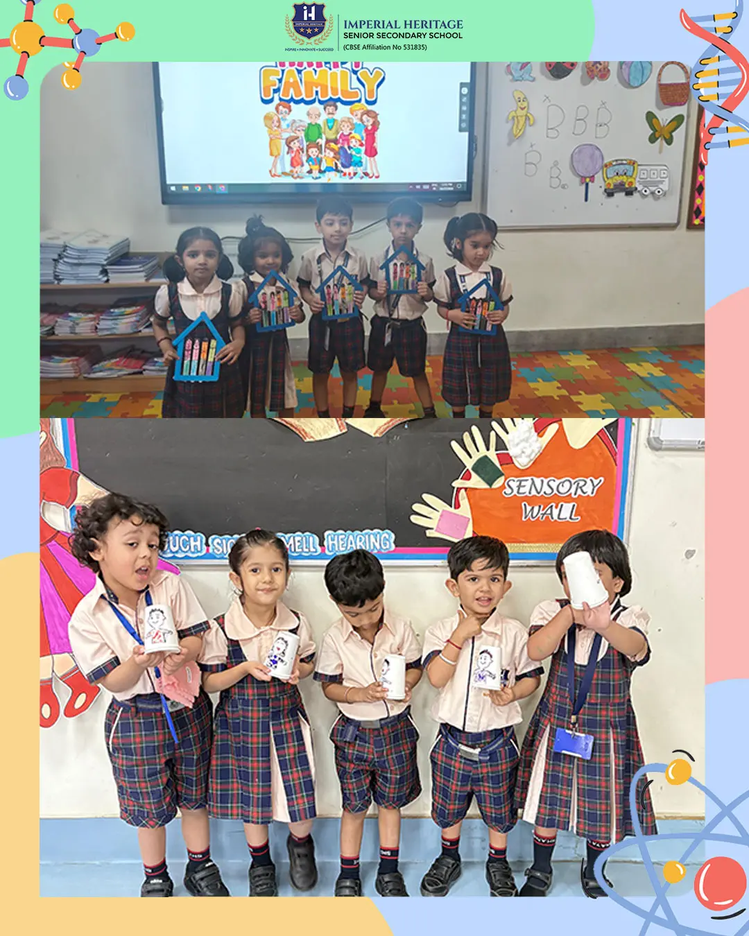The highlight of the week was the “My Popsicle Family” activity by LKG, where children used colourful ice cream sticks to creatively represent their family members, beautifully showcasing their love and bonds. Our UKG students designed their own “All About Me” cards, “My Colourful Self,” sharing their age, drawing themselves, and illustrating their families with vibrant colours.